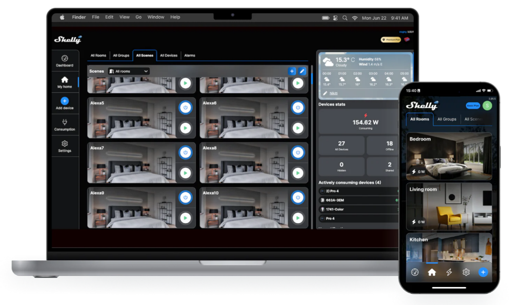 Seria Gen3 wprowadza „wirtualne komponenty, które zmieniają sposób zarządzania i kontrolowania urządzeń innych firm. W aplikacji Shelly Smart Control możesz teraz tworzyć wirtualne urządzenia, integrując produkty innych firm niż Shelly w ujednolicony system sterowania. Ta funkcja zapewnia usprawnioną kontrolę wszystkich inteligentnych urządzeń, niezależnie od marki, z jednego interfejsu.
